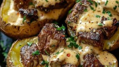 Steak-Stuffed Baked Potatoes with Creamy Parmesan Sauce