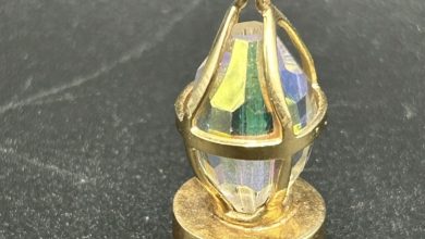 A small gold-colored charm shaped like a lantern, approximately an inch in length, with a crystal center and a 14k…