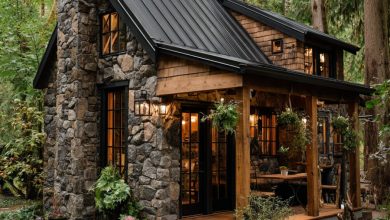 Inspired by the serene beauty of lush forest landscapes, this concept art for a woodland retreat cottage envisions a harmonious…