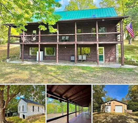 In addition, the main structure offers two full kitchens, a living room with a fireplace, and a spa room with a sunken hot tub. Covered porches at the front and rear overlook the surrounding landscape, adding outdoor living space. A Generac backup generator supports the home during power outages.