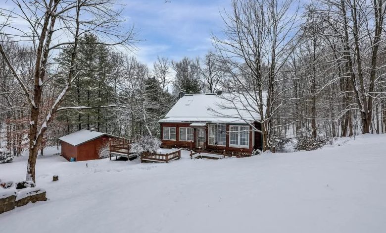 Winding back through the woods along a private drive, you’ll arrive at the 100-acre parcel, which features a charming and welcoming log cabin home positioned in an exceptionally scenic setting. Surrounded by mature trees and breathtaking wooded views, this cozy residence offers a rustic yet comfortable retreat from everyday life.