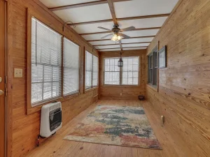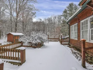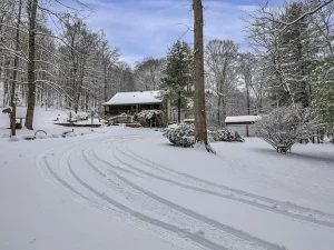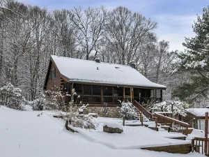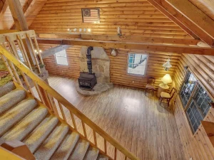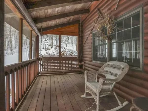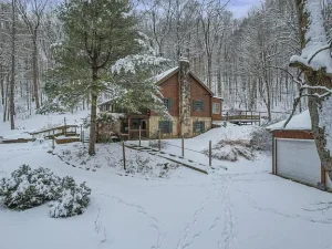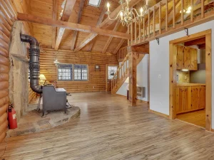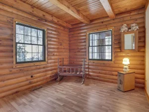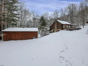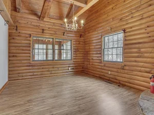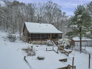 Winding back through the woods along a private drive, you’ll arrive at the 100-acre parcel, which features a charming and welcoming log cabin home positioned in an exceptionally scenic setting. Surrounded by mature trees and breathtaking wooded views, this cozy residence offers a rustic yet comfortable retreat from everyday life.