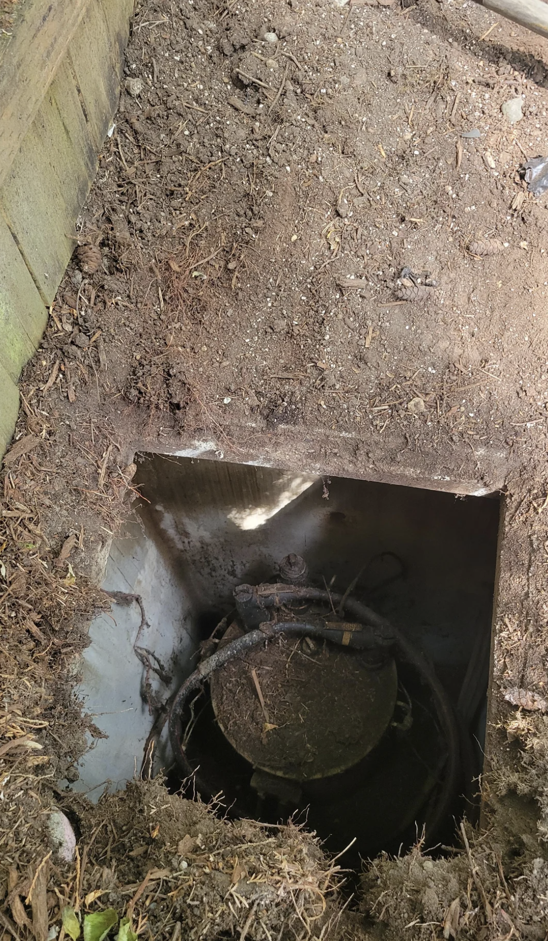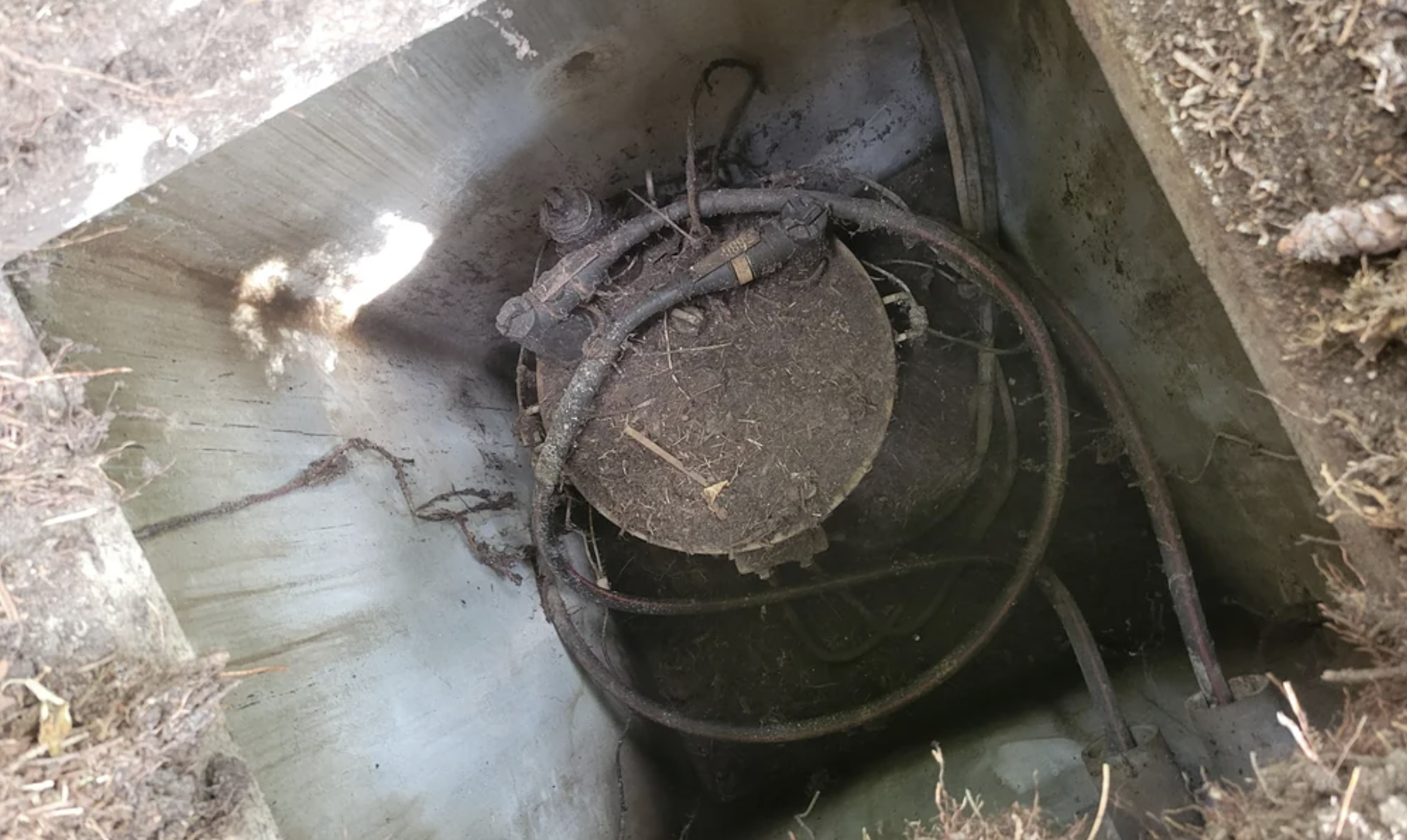 While leveling dirt near a fence, the homeowner noticed a large metal grate just under the top soil. The homeowner picked it up. They thought it was an old septic tank lid or irrigation access. As they dug deeper they found a concrete vault with a cylindrical metal object inside. A thick black cable surrounded the cylindrical object. The equipment was hot.