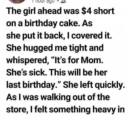 She thanked me with a sincerity heavier than any conversation I’d had in years, then hurried away, leaving me standing in the checkout lane with a heart suddenly both fragile and full. As I finished my shopping, the store felt different. The people around me weren’t just faces in a crowd—they were individuals carrying unseen burdens.