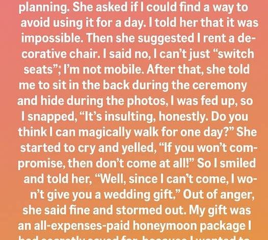 Out of anger, she said fine and stormed out. My gift was an all-expenses-paid honeymoon package I had secretly saved for, because I wanted to surprise her with something unforgettable. I think she asked my mom what the gift was (only my mom knew, I told her), because yesterday she suddenly apologized and told me she didn’t mean what she said. In that moment, everything felt heavy. I loved my sister deeply, but her request cut deeper than she understood. It wasn’t just about a chair — it was about being asked to erase part of my life, my reality, for someone else’s picture-perfect moment. I spent years learning to accept myself again after my accident, and hearing her focus more on aesthetics than my dignity stung in a way I hadn’t expected.
