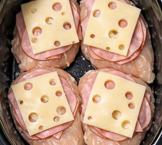Lightly grease a 5–6 quart slow cooker. Arrange the chicken breasts in a single layer on the bottom. Add the chopped ham over the chicken, then place the Swiss cheese slices on top.