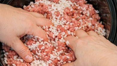 Mix raw white rice into raw ground beef, along with 3 other ingredients, into slow cooker for a hearty meal that’s my default when I don’t know what