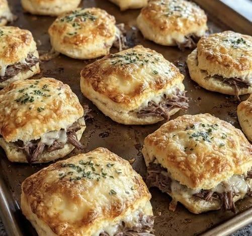 These simple, handheld sliders deliver everything you love about a classic French Dip sandwich—tender roast beef, melted cheese, and savory au jus—tucked inside a warm, buttery biscuit.