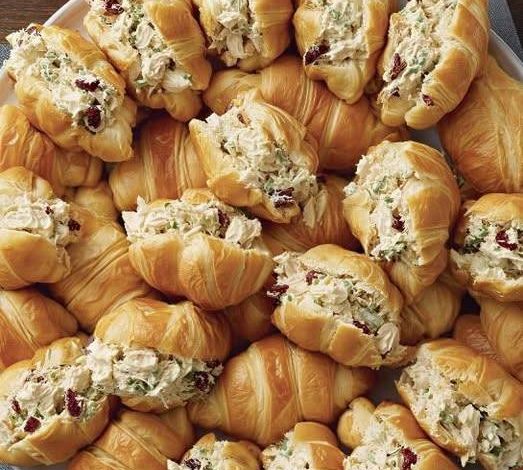 These elegant, bite-sized sandwiches are filled with a classic chicken salad made with celery, green onions, and Dijon mustard, all nestled inside flaky croissants.