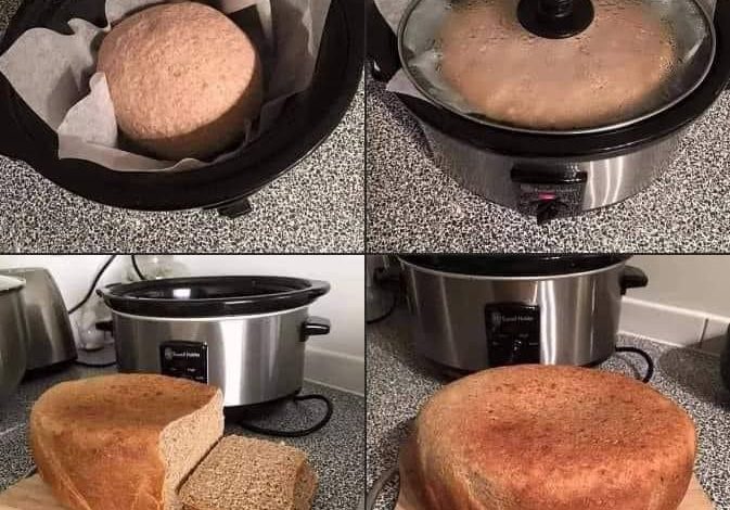 Line your slow cooker with cooking (baking) paper and place in your round ball of dough. I will rise in the slow cooker as it heats through. Cook on High power for 2- 2.5 hours. Start checking at every 7-10 minutes until top is sponge-y but springs back and no moisture on the top. The bottom should be a nice brown colour as well as sides. I put mine (just the loaf) in the oven on broil/grill for less than 5 minutes to get a nice crusty top too!