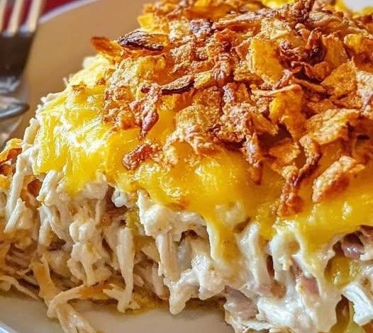 This cozy Crunchy Chicken Casserole is a rich, simple comfort dish made with tender shredded chicken, mixed veggies, and a creamy base, all finished with a buttery, crisp topping made from cornflakes or fried onions.