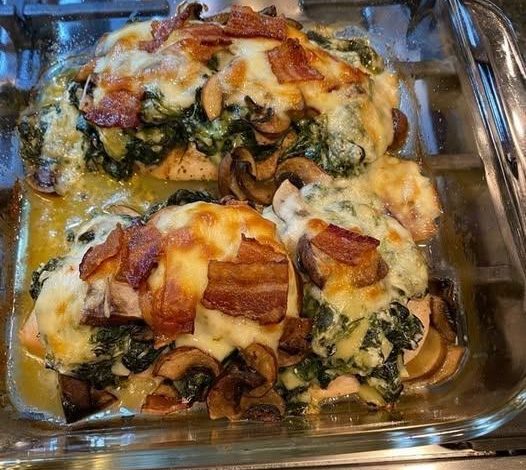 “Chicken in Creamy Spinach with Bacon and Mushrooms”