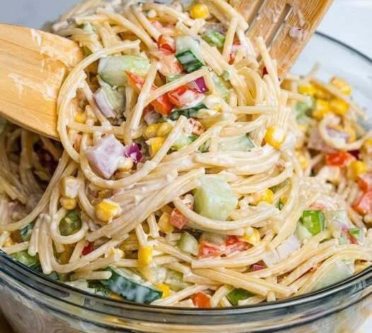 There’s something undeniably comforting about a creamy pasta salad, and this one brings both nostalgia and a playful spin to the table. With crunchy vegetables, tender spaghetti, and a tangy, savory dressing, this Confetti Salad lives up to its name—bright, festive, and full of flavor.
