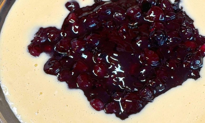 - Assemble the Pie: Pour the batter into the prepared pie pan. Carefully spoon the blueberry filling into the center of the poured batter. Do not spread the filling; let it sink into the batter on its own.