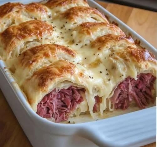 This Crescent Reuben Bake puts a crowd-friendly spin on the classic deli favorite. Savory corned beef, tangy sauerkraut, and gooey Swiss cheese are layered between two buttery sheets of crescent dough, then baked until flaky and golden. It delivers all the bold Reuben flavors you love—without the hassle of assembling individual sandwiches. The sprinkle of caraway seeds is the magic touch, recreating that unmistakable rye bread flavor in every bite.
