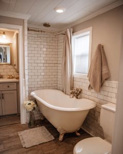 In the bathroom, vintage elements take center stage with a classic clawfoot tub and subway tiles in neutral hues, creating a timeless, elegant atmosphere. Modern fixtures ensure functionality and comfort, seamlessly integrating with the vintage aesthetic of the space. The layout is thoughtfully designed to maximize space and efficiency, with ample storage and a soothing color palette that promotes relaxation. The bathroom’s blend of vintage charm and modern convenience makes it a standout feature of the bungalow.