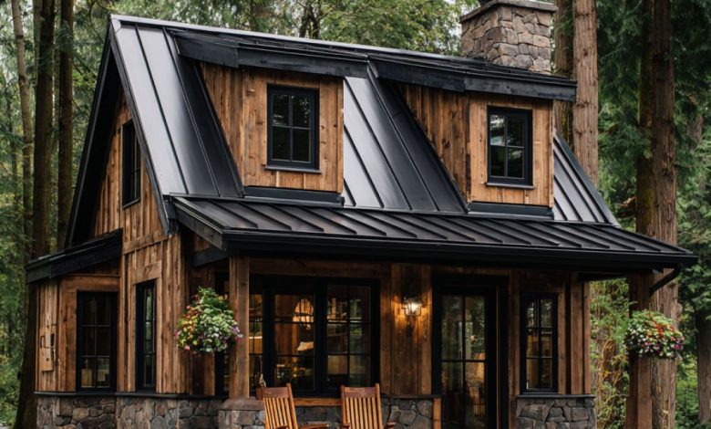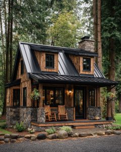 The exterior of the forest lodge bungalow exudes rustic charm with its wooden siding and robust stone foundation, creating a harmonious blend with the surrounding woodland. Its sleek black metal roof, accented by quaint dormer windows, adds a touch of modern flair while enhancing its timeless appeal. The inviting front porch, adorned with wooden rocking chairs and vibrant hanging flower baskets, beckons visitors to sit and soak in the serene environment. The earthy palette of natural wood tones juxtaposed with the striking black roof and window frames ensures the bungalow stands out yet effortlessly integrates with its lush surroundings.