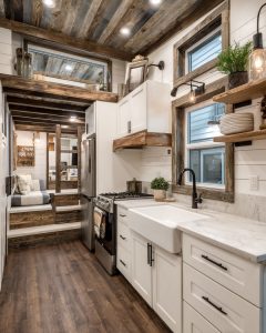 The kitchen area offers a modern counterpoint to the rustic charm found throughout the bungalow. Sleek white cabinetry and quartz countertops provide a clean, contemporary feel, while a farmhouse sink and rustic wood accents ensure a seamless integration with the design’s overall aesthetic. The space is both functional and visually appealing, with ample storage and counter space for culinary endeavors. The kitchen’s design reflects a commitment to both style and practicality, making it a delightful area for both cooking and entertaining.