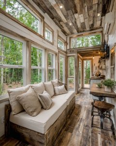 Inside the living area, the bungalow’s rustic allure continues with distressed wooden floors and shiplap walls that evoke a cozy, inviting atmosphere. Plush furnishings in neutral tones are strategically placed to enhance comfort, inviting relaxation and conversation. Large windows allow ample natural light to flood the space, creating a seamless connection with the verdant woodland outside. The interior design skillfully balances rustic elements with modern touches, ensuring a living area that feels both timeless and contemporary.