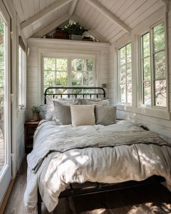 The bedroom of the bungalow provides a serene and restful retreat, with high ceilings and shiplap walls contributing to its airy, spacious feel. A wrought-iron bed, adorned with calming neutral linens, invites relaxation and restful sleep. Large windows allow natural light to filter in, enhancing the connection with the tranquil outdoor setting. The design strikes a perfect balance between rustic charm and modern comfort, creating a sleeping space that is both cozy and elegant.