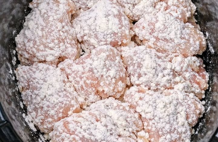- Place floured chicken in slow cooker.