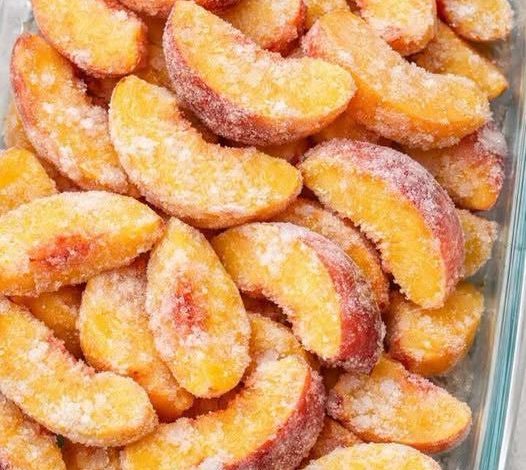 Dump rock-hard frozen raw peach slices in the casserole dish and 4 other basic pantry items to get a dessert so delicious your friends will be begging for more!