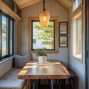 The dining area is an intimate and elegant space that centers around a handcrafted wooden table, offering a perfect setting for both everyday meals and special gatherings. A pendant light casts a warm glow over the table, enhancing the cozy ambiance of the room. The walls are adorned with personal artwork, adding a touch of personality and charm to the space. This area seamlessly blends traditional craftsmanship with modern design, creating a dining experience that is both stylish and welcoming.