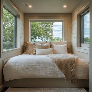 The bedroom is a tranquil retreat designed to promote rest and relaxation. A plush bed takes center stage, surrounded by neutral-toned walls that enhance the calming atmosphere. A large window allows natural light to fill the room, offering views of the serene surroundings and creating a peaceful environment. Thoughtful design elements, such as soft textiles and warm lighting, contribute to the overall sense of comfort and tranquility in this personal sanctuary.