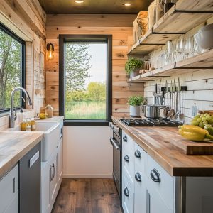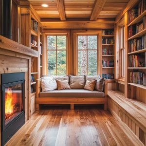 The living area of this timber cabin retreat exudes warmth and comfort, embodying a harmonious blend of rustic charm and modern elegance. The Craftsman-style design is evident in the built-in bookshelves that flank a glowing fireplace, creating a cozy nook perfect for relaxation. A comfortable sofa invites residents to unwind, while warm hardwood floors add to the inviting atmosphere. Natural light streams in through the large windows, illuminating the space and highlighting the thoughtful design elements that make this living area a true sanctuary.