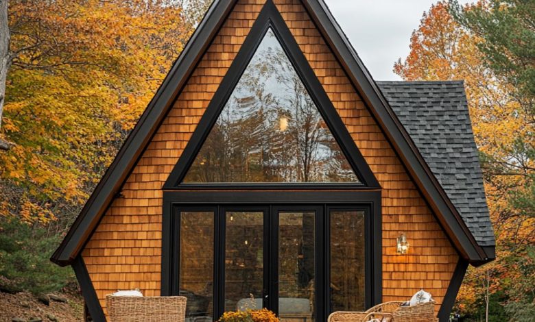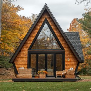 The exterior of this cozy A-frame chalet is a testament to the seamless integration of architecture with nature. Clad in warm-toned wood shingles, the chalet exudes a rustic charm that is both inviting and stylish. The distinctive A-frame design is highlighted by a large triangular window at the peak, allowing natural light to flood the interior and offering a glimpse of the serene surroundings. Dark trim and a slate roof complement the wood tones, adding a touch of modern elegance to the rustic facade. Large ground-floor windows provide expansive views of the vibrant fall foliage, while the front porch, furnished with wicker chairs and baskets, creates an inviting outdoor living space.