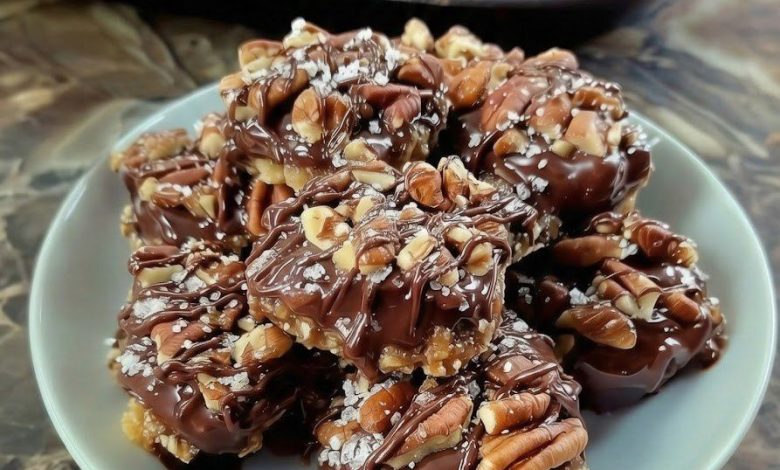 Add Chocolate Layer: Spoon the melted chocolate directly on top of the caramel layer in the center of each nut cluster.