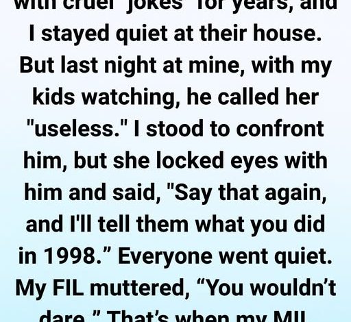 My father-in-law had always been the kind of man who thought sarcasm made him funny. At every family gathering, he’d make comments about my mother-in-law — little “jokes” about her cooking, her memory, or how she “couldn’t do anything right.” Everyone laughed awkwardly, pretending not to notice how uncomfortable she looked. My husband would change the subject, the kids would fidget, and I would sit there, biting my tongue.