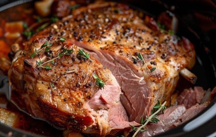 - Trim any excess fat from the pork butt or shoulder and place it in the slow cooker.