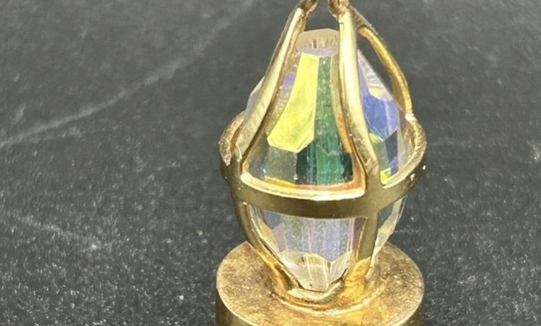 A small gold-colored charm shaped like a lantern, approximately an inch in length, with a crystal center and a 14k stamp located on the bottom of the charm provides more than just visual appeal; its switch and crystal top indicate it’s a vintage 14k lantern charm which exemplifies a time period of mechanical jewelry.