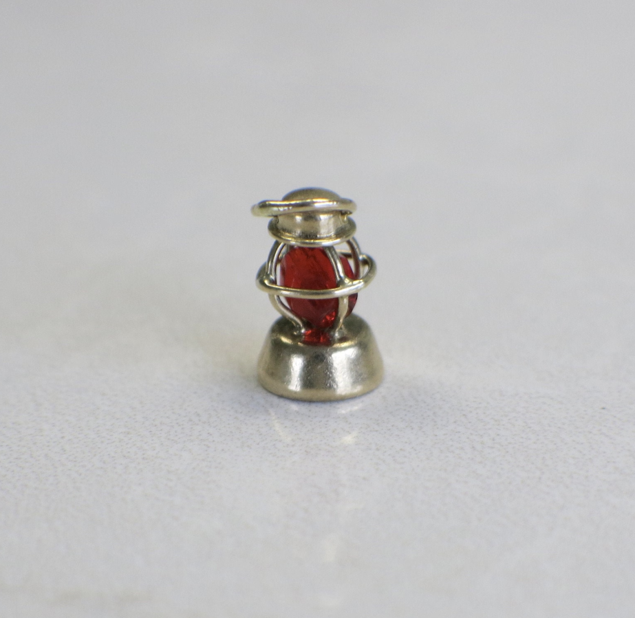 During the latter half of the 1950s through the 1960s, jewelers started creating charms that were mechanical. Many of these smaller pieces would move, open, or illuminate using new watch batteries. This lantern charm utilized a small grain-of-wheat bulb and a battery operated switch to create a realistic glow behind the crystal or glass.