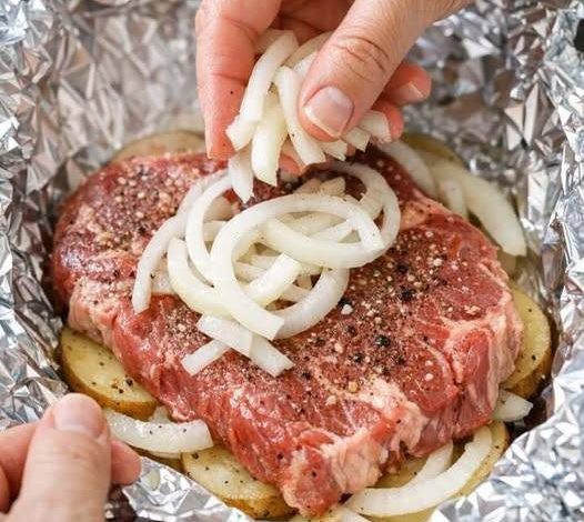 4-Ingredient Beef Steak and Onion Foil Bake