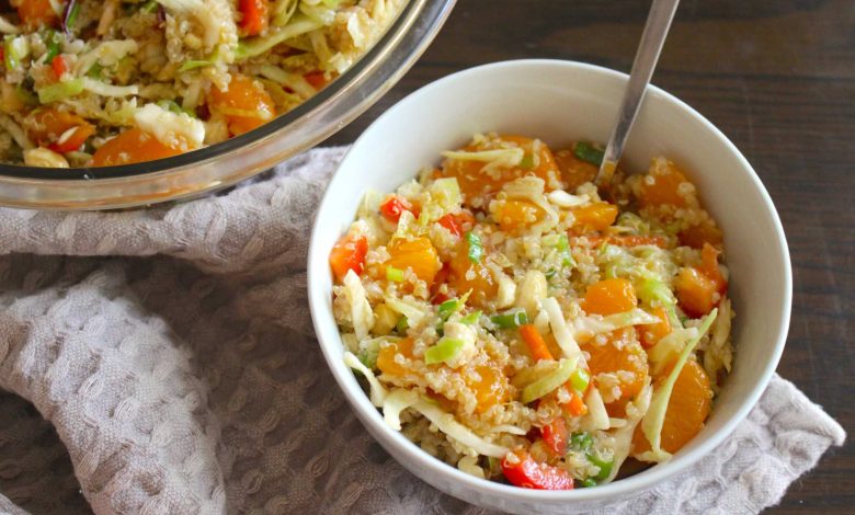 The base of this dish is some fluffy quinoa, packed with protein and perfect for soaking up flavor. From there, we add in a bag of coleslaw mix (but feel free to chop a head of cabbage if you prefer!), juicy mandarin orange pieces, crisp red bell pepper, and a handful of fresh green onions. And don’t forget the nuts! Cashews and sliced almonds bring just the right crunch and additional protein. Packed with all those goodies, this salad is anything but boring!