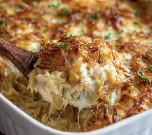 This recipe combines the sophistication of French flavors with the ease of a casserole. Orzo pasta is the quiet hero here — absorbing every bit of goodness from the golden onions, garlic-infused broth, and a splash of cream. The result is a bubbling, golden bake that tastes like it took hours, even though it comes together surprisingly fast.
