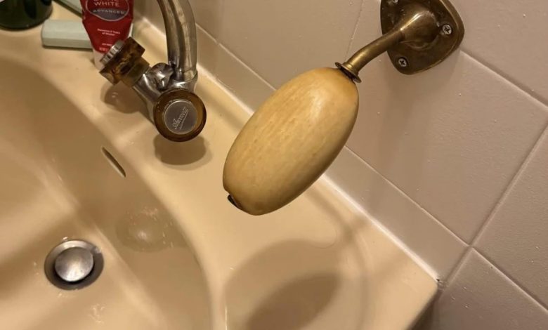 Above the sink, protruding from the tiled wall, was a strange metal arm with a wooden egg. A smooth, pale, oval-esque thing, just hanging there.