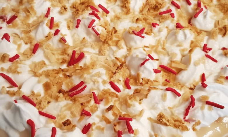 Finalize the Pie: Spoon the complete Piña Colada filling into the prepared cracker shell, spreading it out evenly. Distribute the reserved toasted coconut garnish evenly over the surface.