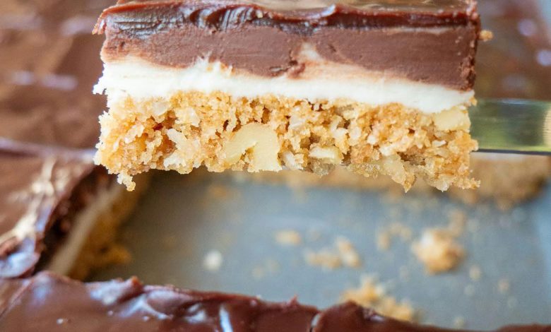 - Finish & Serve: Smooth the melted chocolate over the frosting layer. Wait until the chocolate has set completely before slicing into squares.Bake Base Layer: Press the mixture evenly into the bottom of a 9×13-inch baking pan. Bake for 15-20 minutes, or until the bar layer is set and golden. Once baked, remove from the oven and set aside to cool completely.