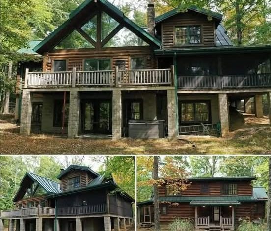 Inside the main log home, you’ll find 3 bedrooms and 2.5 bathrooms, including a main-level primary suite. The spacious living room features vaulted ceilings, exposed log beams, and a dramatic stone fireplace that anchors the space. Natural light pours in through large windows, creating a warm, inviting atmosphere ideal for both quiet mornings and family gatherings.