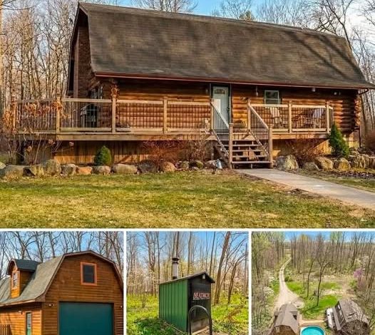 Discover your private sanctuary with this stunning log cabin-style home set on over 5 acres of serene countryside. Combining rustic charm with modern amenities, this property offers a rare opportunity for privacy, relaxation, and exceptional outdoor living. Tucked away from the bustle, the home boasts sweeping views, a wraparound porch, and a pond, creating the perfect retreat for full-time living, weekends, or vacation rental use.