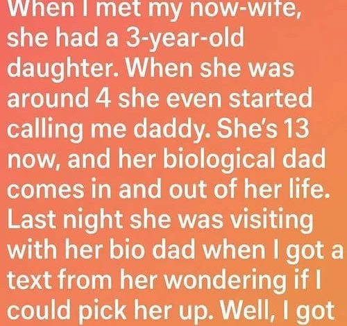 She was three when I met her—curls, cautious eyes, and a stuffed giraffe clutched like armor. By four, she started calling me “Daddy” on her own, like it had always been my name. She’s thirteen now. Her biological father drifts in and out like bad weather. Last night, she was with him when my phone lit up: