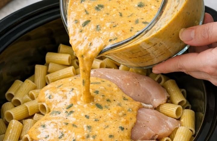 This Slow Cooker Creamy Butternut Squash Chicken Rigatoni blends the earthy sweetness of butternut squash with tender chicken, Italian herbs, and a velvety Parmesan-infused sauce—all finished with al dente rigatoni for a hearty, autumn-inspired meal. The squash melts into the broth as it cooks, creating a naturally creamy, nutrient-rich base without heavy cream.