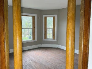Stepping into the home, you are greeted by an entry foyer featuring elegant columns—a detail that adds both charm and a sense of traditional craftsmanship. This architectural touch sets the tone for the character found throughout the home. The foyer flows into a spacious living room, forming a welcoming area that can transform into the heart of the home once restored. With its sizeable footprint, the living room can easily accommodate various furniture arrangements, making it a flexible and inviting space for gatherings, relaxation, and daily activities.