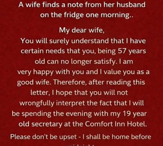 The betrayal did not arrive with a shouted argument or a dramatic confrontation. Instead, it manifested as a small, unassuming slip of paper pinned to the stainless steel door of the refrigerator. When Evelyn walked into the kitchen that Tuesday morning, the sunlight catching the dust motes in the air, she felt a strange premonition. She reached out, her fingers steady, and unpinned the note. As she read the words Richard had penned, she felt the world around her tilt. He had written to her with a cold, clinical detachment that was more painful than anger. He spoke of “needs” and “limitations,” citing her age of fifty-seven as a barrier to his personal fulfillment. He informed her, with a chilling lack of remorse, that he would be spending the night at the Comfort Inn with his nineteen-year-old secretary. He even had the audacity to ask her not to be upset, promising a return before the stroke of midnight.
