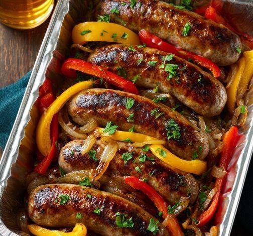 - Bake: Bake in the preheated oven for about 25-30 minutes, or until the sausages are browned and cooked through, and the vegetables are tender.