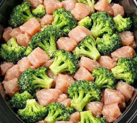 Layer the frozen broccoli on top of the chicken. Using it straight from frozen helps maintain texture and adds moisture during cooking.