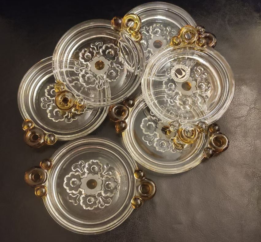The primary function of vintage glass furniture coasters was to protect delicate surfaces from scratches and wear caused by the movement of furniture. Placing these coasters under  table legs, chairs, or other heavy furniture distributed weight more evenly, reducing the risk of damage to floors and preventing unsightly scuffs.